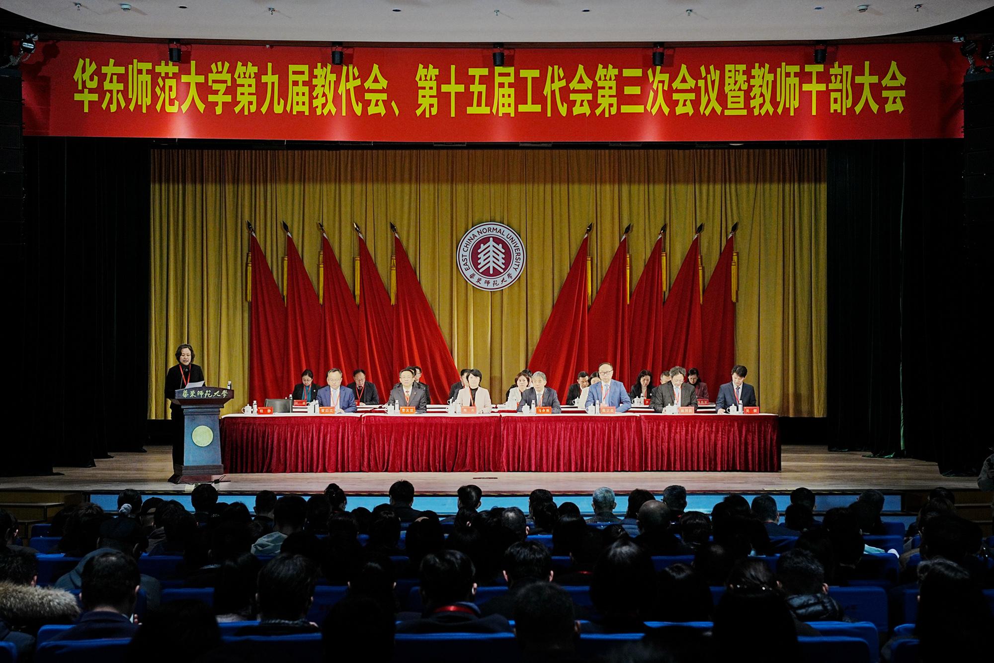 3月26日下午,华东师大第九届教职工代表大会暨第十五届工会会员代表大会第三次会议在普陀校区思群堂闭幕。