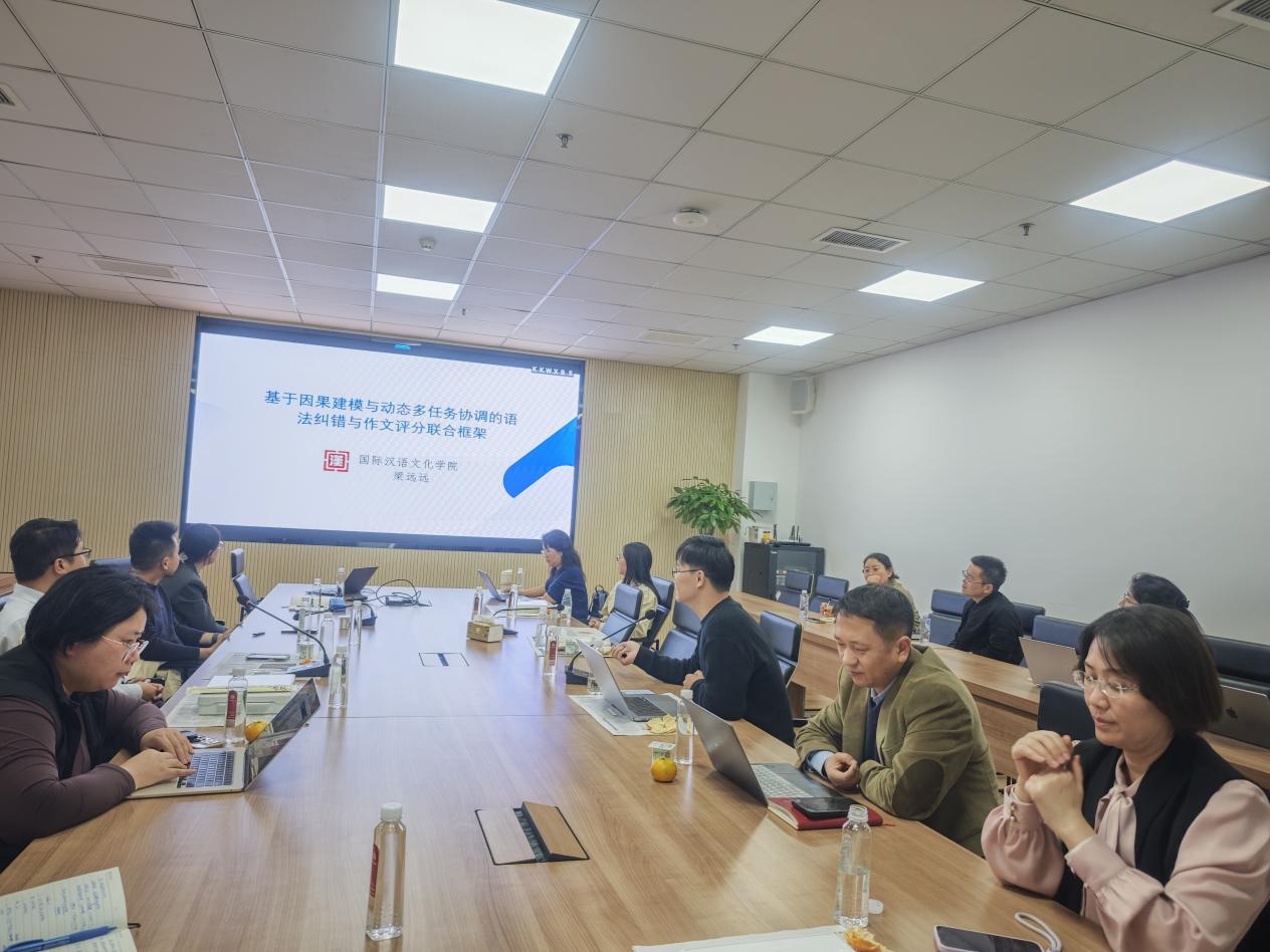国际汉语文化学院专任助理研究员梁远远老师作了题为“基于因果建模与动态多任务协调的语法纠错与作文评分联合框架”的分享报告,介绍了团队依托学校人工智能赋能人文社科研究范式转型项目“基于多任务学习与可解释性分析的留学生作文偏误归因与评分系统”在人工智能赋能国际中文教育领域的创新实践。该系统包含了语法纠错模块(GEC)、自动评分模块(AES)、因果中介分析模块(CMA)和动态多任务协调模块(DMC)四个核心模块,通过四模块的有机联动,形成了GEC →生成纠错与编辑信号 →AES →预测评分 →CMA →分析因果效应 → 动态协调模块 → 调整训练权重 → 返回GEC的因果学习闭环,实现了对留学生中文作文的智能评价与精准纠错。与会者与梁远远老师围绕数据类型、与市面上其他作文评分系统及类似硬件设备对比等问题进行了交流研讨。