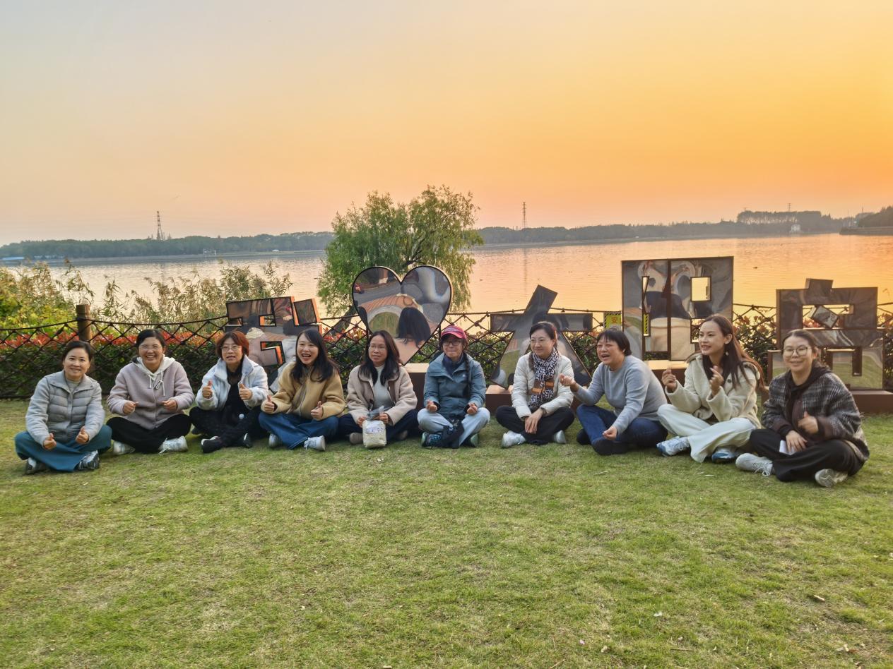 抵达太阳岛时,夕阳正缓缓西沉,为广袤的草坪披上了一层温柔的金纱。老师们三五成群漫步湖畔,湖面波光粼粼,倒映着漫天霞光与岸边的斑斓树影,微风携着草木的清香拂面而来。大家纷纷卸下工作的忙碌,或驻足观景、用镜头定格美好瞬间,或促膝长谈、交流工作心得与生活趣事,欢声笑语与秋日的静谧悄然交融,构成了一幅温馨和谐的画面。