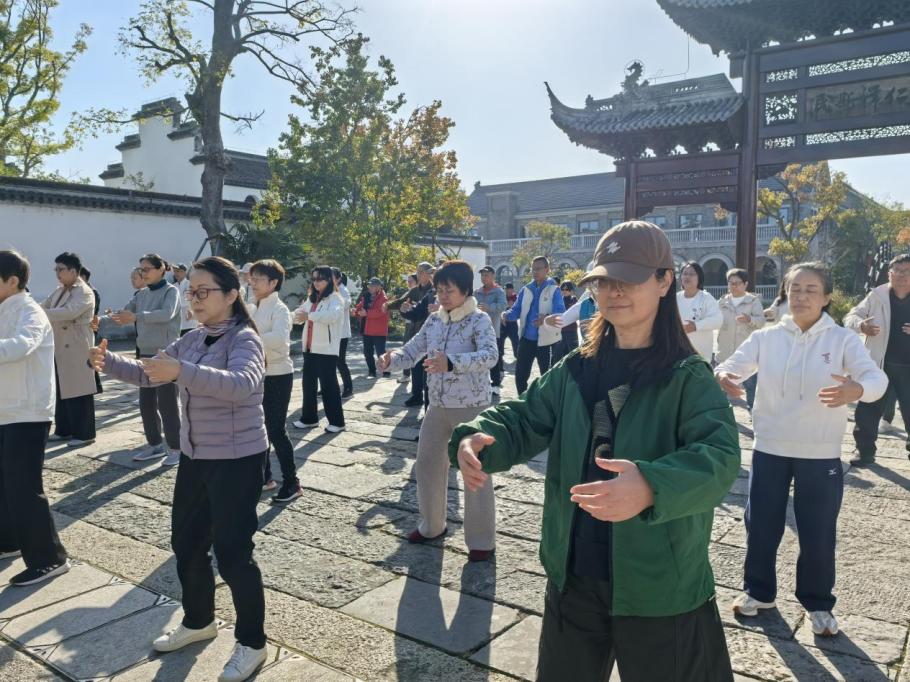 飞檐斗角、浮于水面的博物馆群落与金黄的银杏、火红的枫叶相映成趣,构成了一幅绝美的秋日画卷。在这样一个集自然美景与人文底蕴于一体的环境中,协会的习拳活动正式拉开帷幕。在会长李富刚老师的带领下,老师列队整齐,凝神静气,起势、金刚捣碓、懒扎衣……一招一式,刚柔并济,舒缓自如。太极的神韵与广富林的古朴静谧完美融合,动与静、力与美在此刻达到了和谐的统一,吸引了众多游园市民驻足观看与赞叹。习拳间隙,老师们还漫步园中,感受历史的厚重与文化的传承。