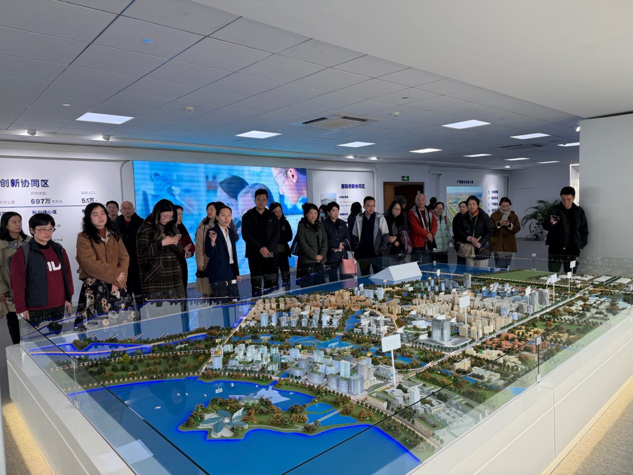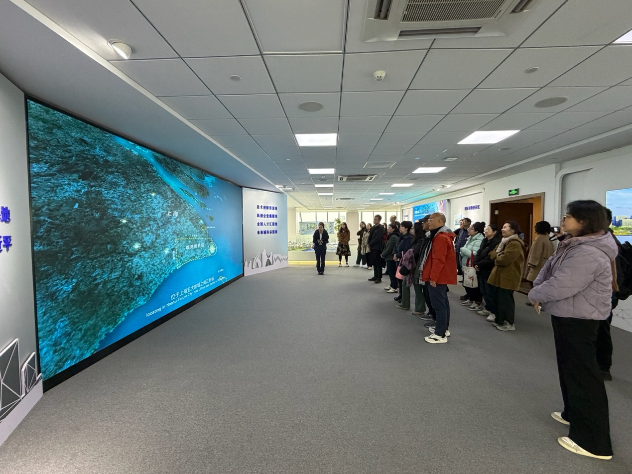 在临港新片区创晶科技中心,老师们通过全域沙盘系统,系统了解了临港在智能汽车、集成电路、生物医药与人工智能等核心产业的整体布局情况,考察了无人驾驶测试道路、科创企业集聚区与创新配套空间等建设规划。随后,大家一同鸟瞰华东师范 大学临港校区整体风貌。该校区毗邻东海大桥,依托临港产业优势,正致力于在产业实践与学术研究之间构建跨界融通的创新桥梁。
