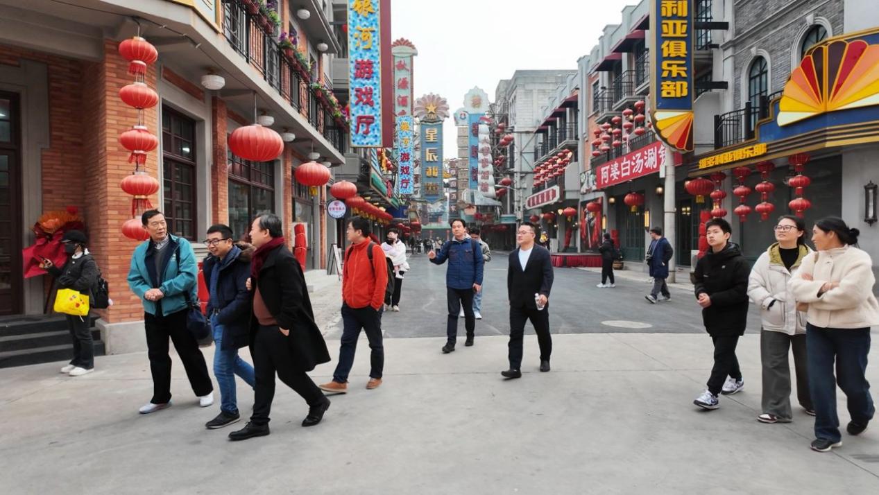 踏入影视城的瞬间,仿佛穿越了时光长廊。复古的有轨电车缓缓驶过铺满碎石的街道,欧式风格的尖顶建筑与青砖黛瓦的石库门民居相映成趣,街边悬挂的老式招牌、霓虹彩灯,瞬间将人拉回了二十世纪三、四十年代的老上海。老师们纷纷驻足,或指着熟悉的场景追忆起曾经的红色岁月,或拿出手机与同伴合影留念,想要将这独特的景致定格。漫步在南京路、外滩等复刻场景中,黄包车、老爷车穿梭其间,身着民国服饰的演员擦肩而过,恍惚间竟有置身影视剧片场的错觉。几位年轻教师饶有兴致地坐上黄包车,体验着老上海的出行方式,爽朗的笑声回荡在街巷里。走到影视体验馆,大家还围观了一场小型的情景剧表演,精彩的演绎引得众人连连鼓掌。
