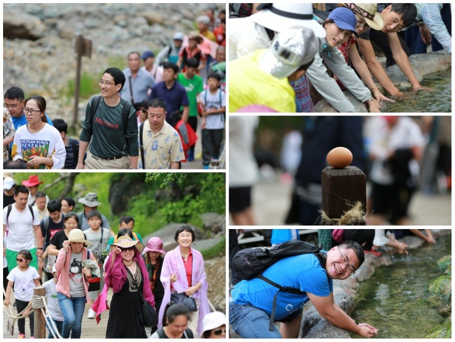 长白山是一座休眠的活火山,地热资源非常丰富,山下的聚龙温泉群可以看到很多小泉眼,热气也会时不时冒出。此景点可以品尝特色的温泉鸡蛋,水温常年42度,用手感受一下,非常舒服。温泉水煮出来的鸡蛋蛋黄凝固,蛋白嫩滑,撒一点盐,味道鲜美,而山坡上的温泉眼水温常年83度。