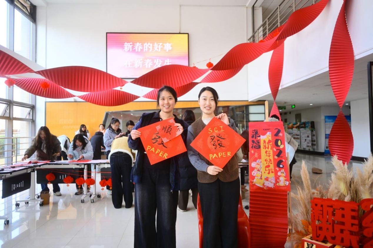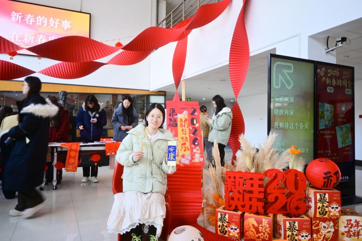 对联区红纸铺展、墨香四溢,是现场最具人气的角落。师生们挥毫泼墨,将新春期许凝于笔端。擅长书法的老师笔下,“骏马奋蹄探科研秘境,春风送暖结学术硕果”等春联一气呵成;初学的同学虽笔画稚嫩,却也在一笔一划里写满真诚。各式字体的“福”字、“如意”“安康”等吉祥词跃然纸上,这份亲手书写的祝福,比印刷的春联多了一份心意,也让传统文化的根脉在笔墨间扎根。