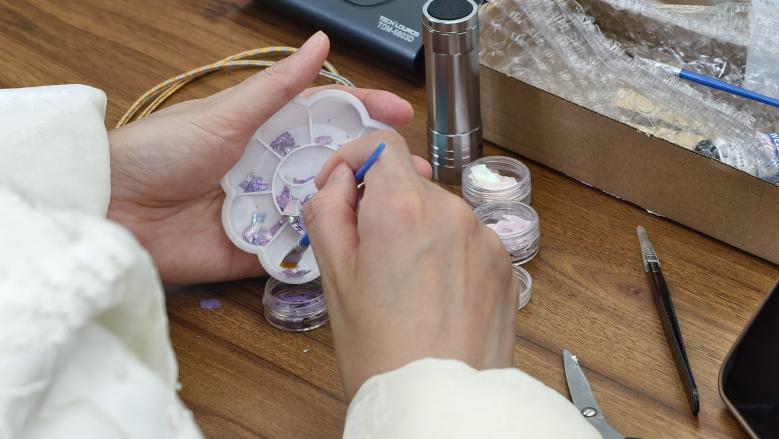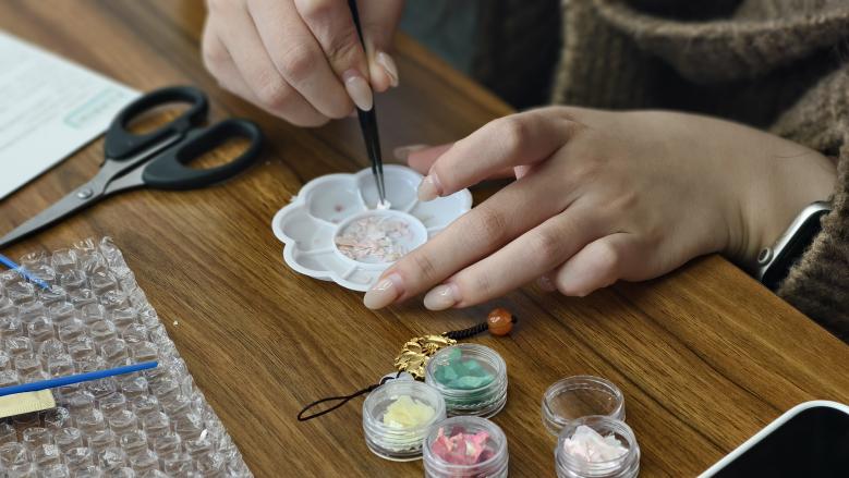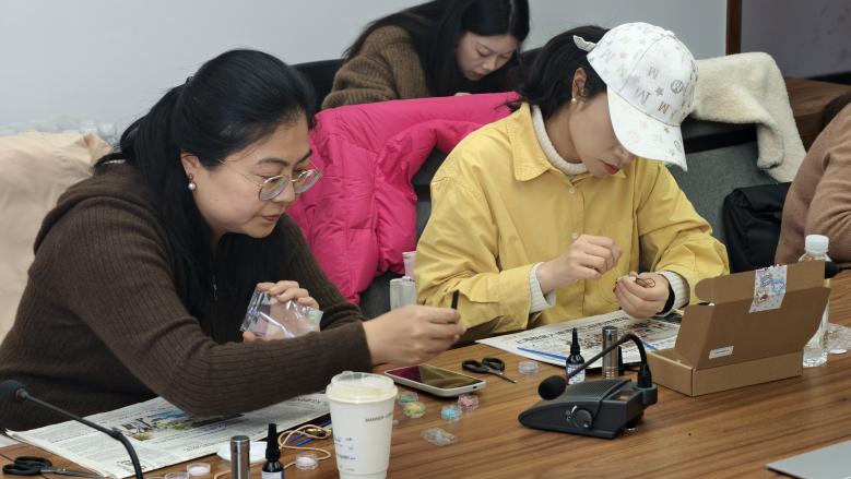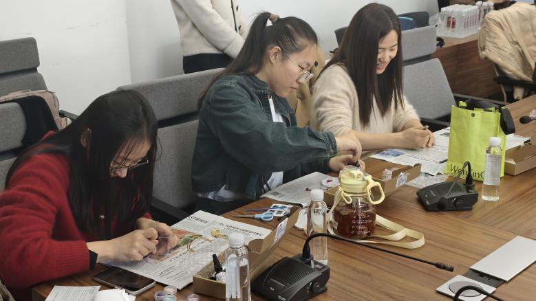 最令人期待的螺钿挂件制作环节,筹备组老师提前备好贝壳薄片、底托、胶水、镊子等材料,并进行细致的步骤演示,从贝片打磨、图案设计,到粘贴固定、封层提亮。辅导员们迅速投入创作,化身“非遗匠人”,手持镊子屏息凝神,将细碎的贝片小心翼翼地粘贴在底托上,或拼接成简约传统纹样,或搭配成雅致花鸟造型,时而交流配色技巧,时而请教操作细节,现场气氛温馨而热烈。