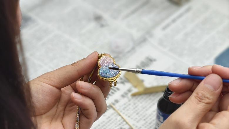 经过一个多小时的精心创作,一枚枚独具特色的螺钿挂件相继成型,每一件作品都凝聚着大家的巧思与匠心,流光溢彩的贝片搭配精致的底托,既美观实用,又承载着对传统文化的热爱。大家手持自己的作品合影留念,脸上洋溢着成就感与幸福感。