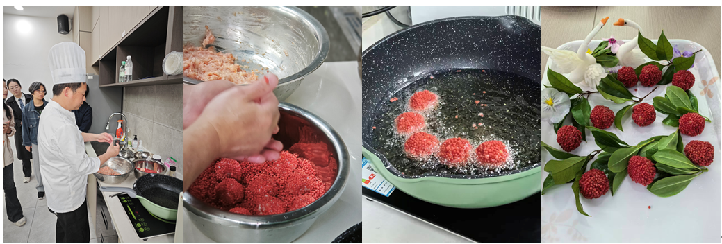 在潘大厨的指导下,大家迅速投入实践,分工协作、相互切磋,现场烟火气十足。遇到塑形不规范、裹粒不均匀、火候掌握不好等问题,潘大厨逐一上手纠正,手把手耐心传授技巧。大家从生疏笨拙到熟练操作,慢慢掌握了制作要领,时不时交流心得、分享经验,欢声笑语弥漫整个现场。