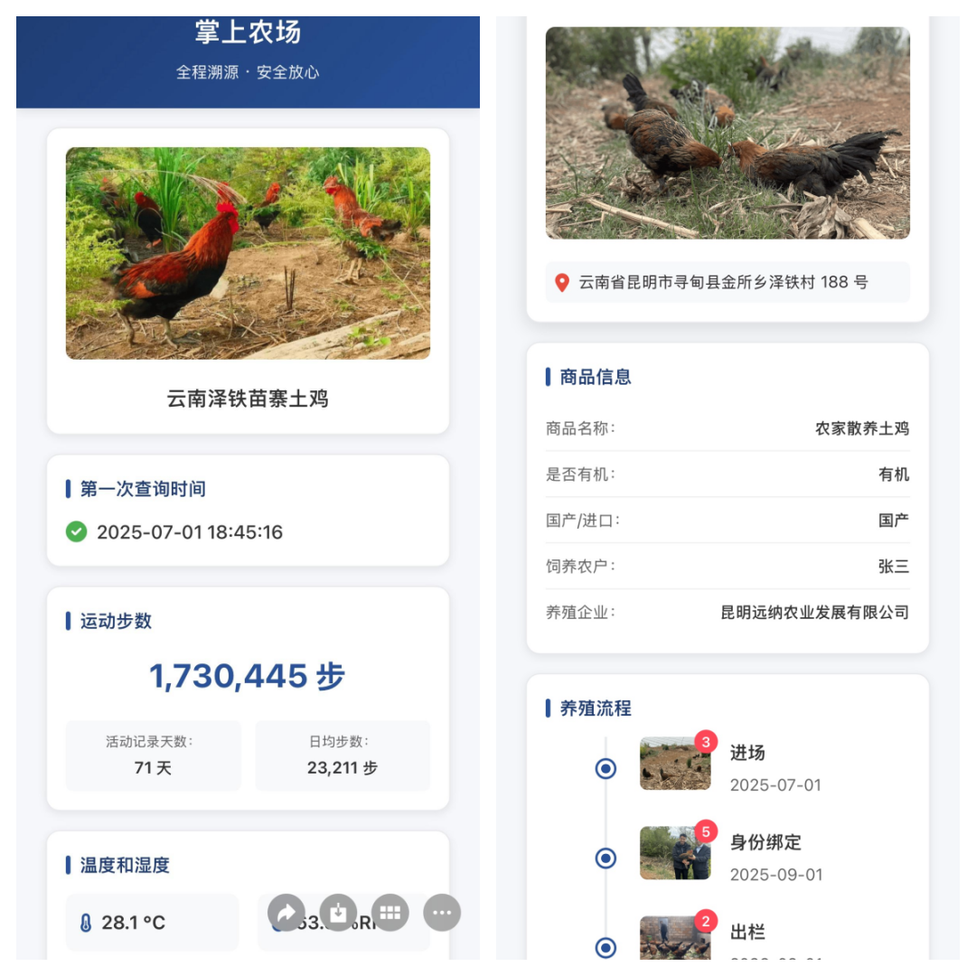 待鸡苗入场后,消费者将获得专属“云托养”二维码,可在线查看苗鸡养殖动态,包括实时监控视频、运动步数、喂养记录、环境温度湿度等信息。